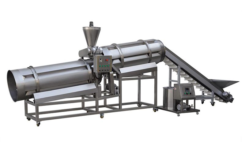 Double drum flavoring machines are mainly used for processing flavor puff snacks, breakfast cereal and other baked snacks food. This type can spray suitable oil and then season powder on the food surface. It consists of double flavoring drums, a hoister, an oil tank and a flavoring powder mixer.